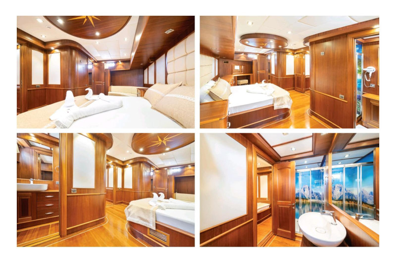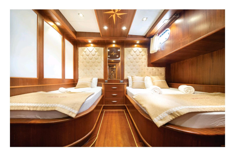 Gulet QUESTA VITA has 6 cabins (2 Master + 2 Double + 2 Triple) for 12 people. All cabins have air conditioning. All cabins have private toilets and showers. There are separate crew quarters.